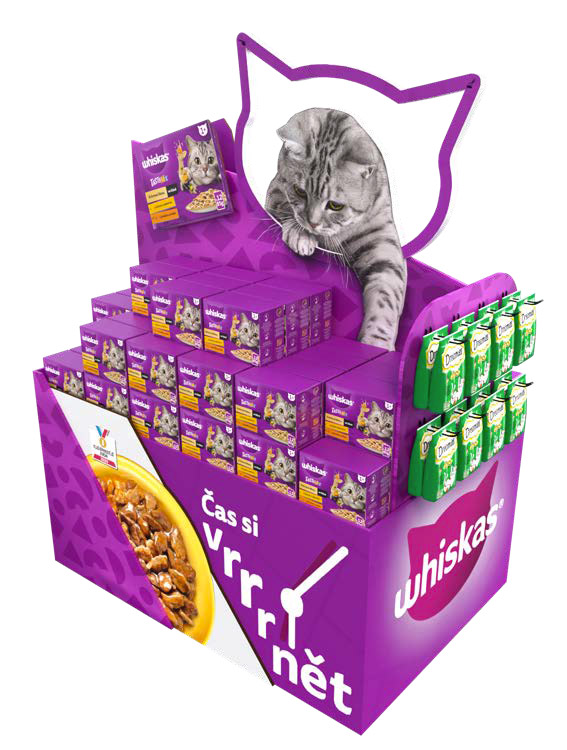 Toto vystavení dokonale zachycuje tento pocit. Moderní design v odstínech fialové a ikonická silueta kočičí hlavy okamžitě upoutají pozornost zákazníků. Hravý 3D model kočky dodává vystavení živost a autentičnost. Nápis „Čas si zavrnět“ vyzdvihuje okamžik, kdy si vaše kočka vychutná svou oblíbenou kapsičku Whiskas. Víceúrovňové uspořádání poskytuje snadný přístup ke všem produktům, což ocení každý zákazník. Tato dekorace dokonale kombinuje vizuální přitažlivost a funkčnost, čímž se stává ideálním řešením pro každého milovníka koček.