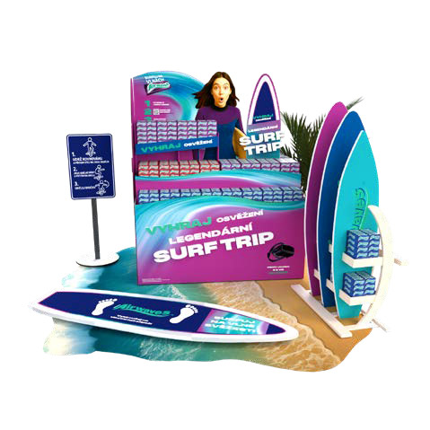 Celá expozice je stylizována jako surfařské molo s pláží, palmami a autentickými surfboardy, které slouží jako nosiče produktů. Hlavní gondola ve tvaru surfu nebo plážového kiosku. Efektivně prezentuje žvýkačky Airwaves v různých příchutích, zatímco další části (např. stojan se surfy) podporují vizuální dojem dobrodružství a volnosti.