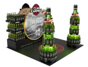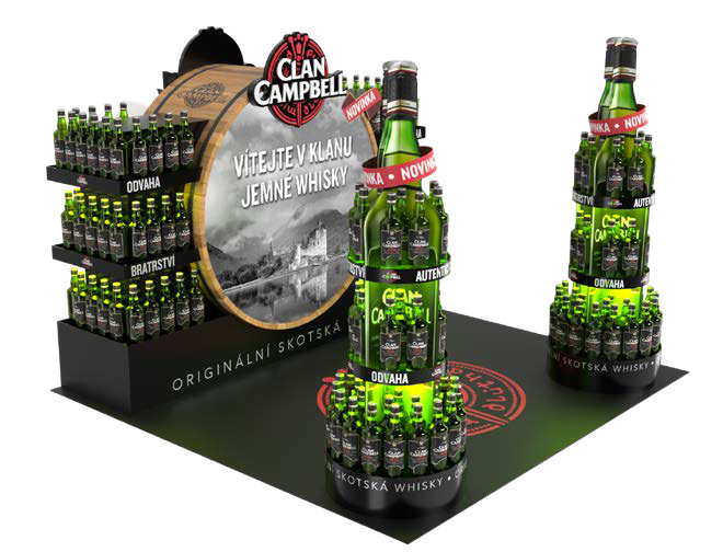 Zároveň jsme měli za cíl pozvat nakupující k vyzkoušení jemné chuti, která je pro Clan Campbell specifická. Pomocí vizuálního ztvárnění jsme pozvali nakupující do světa skotské whisky, a to za využití hlavních symbolů značky (zelené barvy, láhve, červeného emblému značky a loga). Zároveň jsme si o pozornost nakupujících řekli zobrazením symbolů kategorie (dřevěný sud), použitím výrazné světelné plochy (light box v sudu) a stojanů ve tvaru láhve.